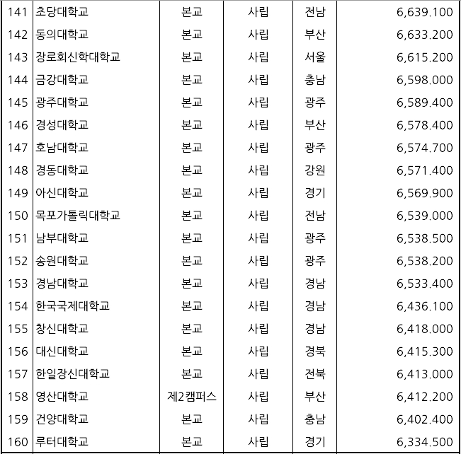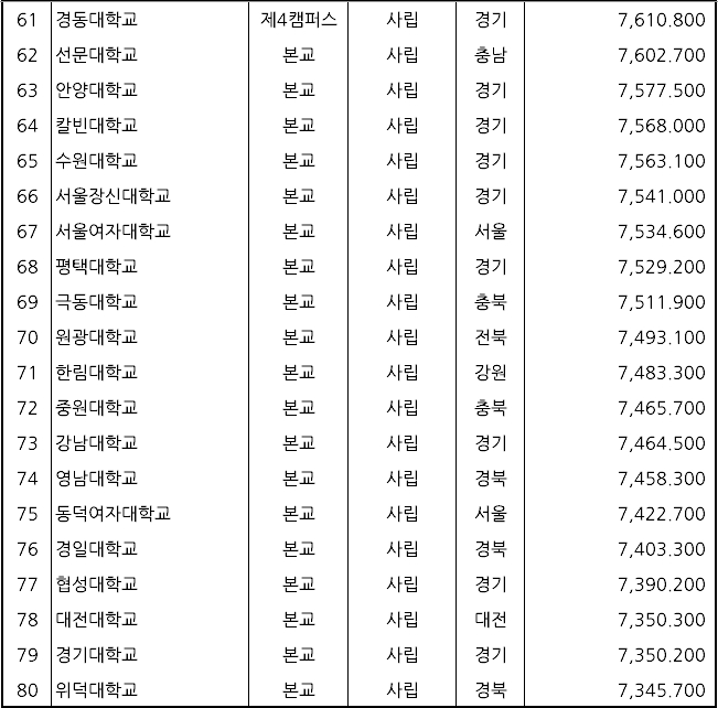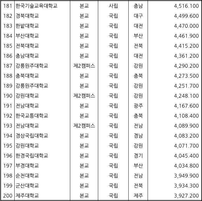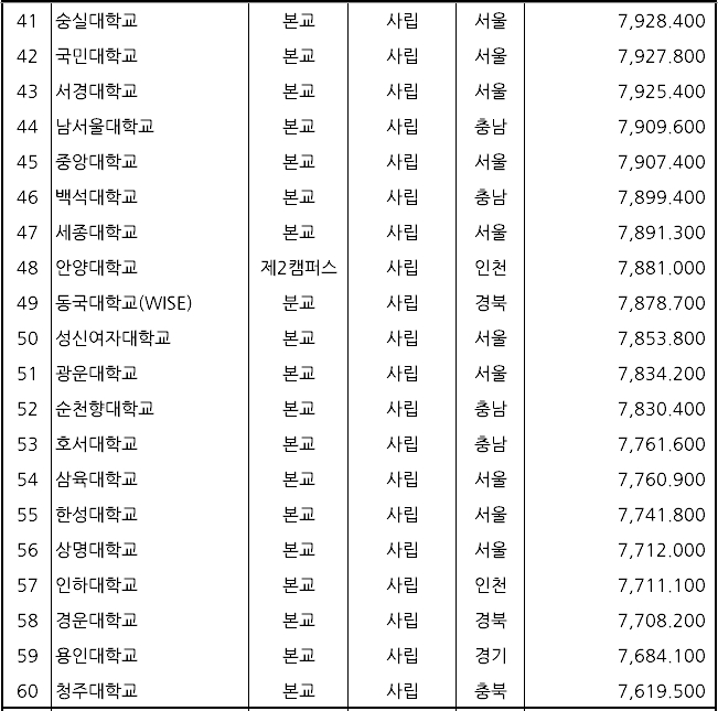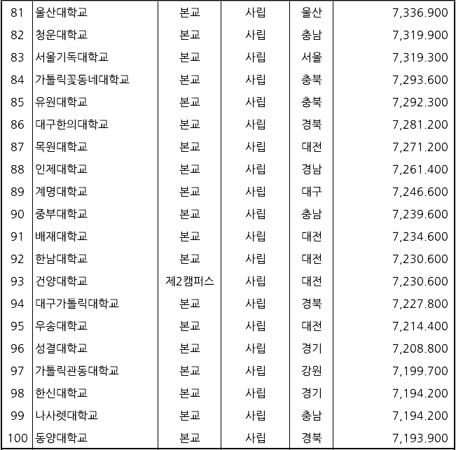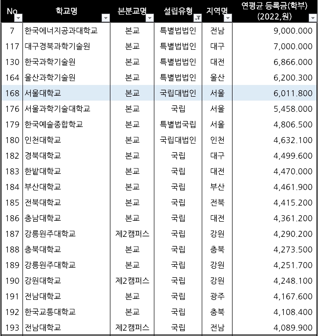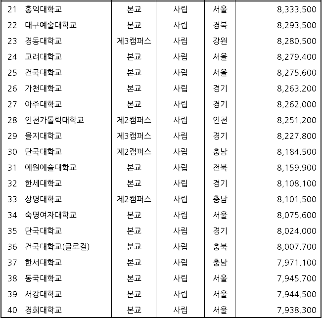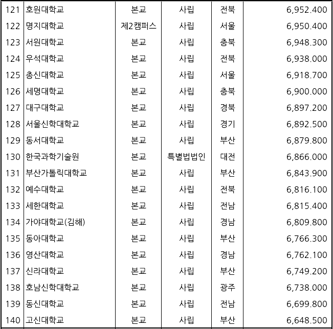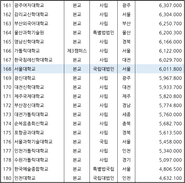▷ 3위: 연세대학교(사립, 9,263,000원) ▷ 19위: 고려대학교(사립, 8,399,000원) ▷ 168위: 서울대학교(국립, 6,012,000원)