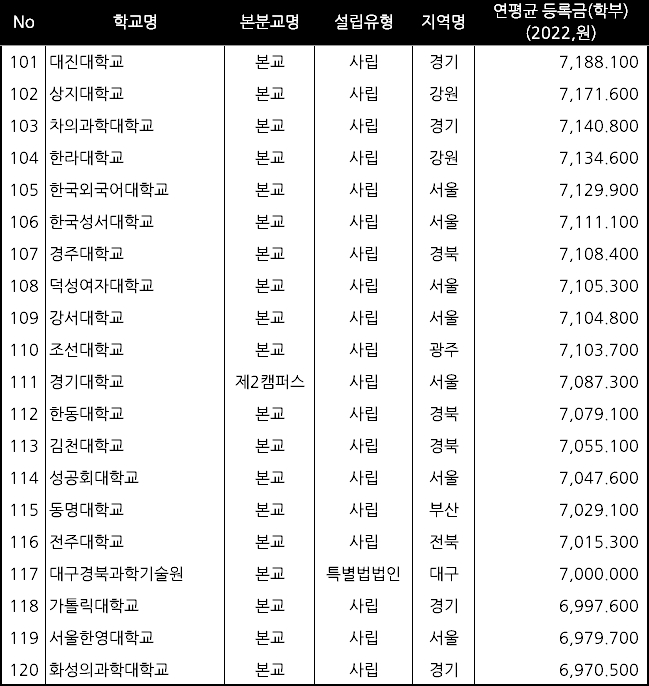 대학 등록금 순위 지역별 정보의 경우 아래에서 확인해 보시기 바랍니다.