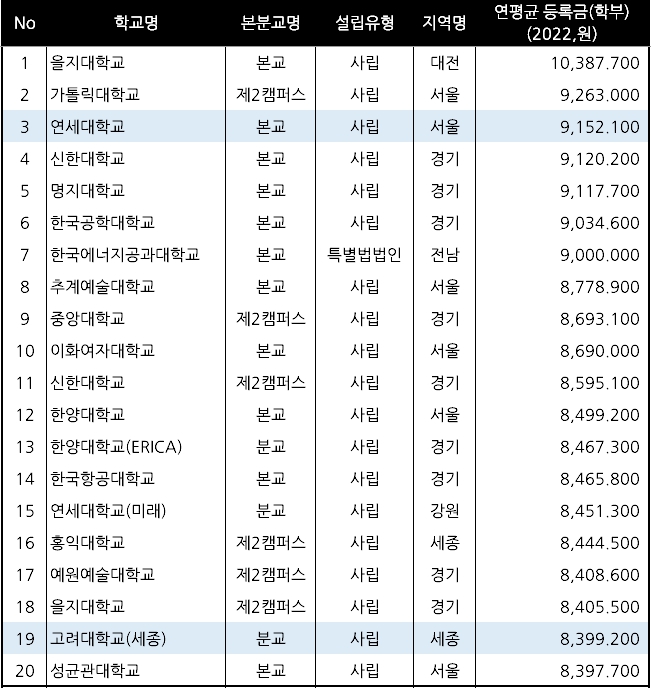 다음으로 대학 등록금 순위 상위 10곳을 알아보자면, 을지대 > 가톨릭대 > 연세대 > 신한대> 명지대 > 한국공학대 > 한국에너지공과대 > 추계예술대 > 중앙대 > 이화여자대학교 순입니다.