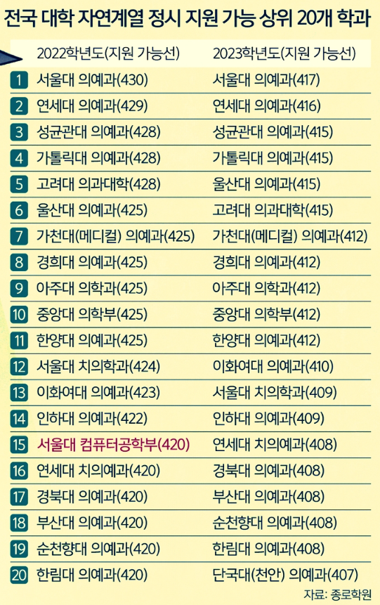 자연계열 상위 20개 학과 최저 합격선(국어·수학·탐구2 표준점수 환산)은 407점이라고 합니다. 서울대 > 연세대 > 성균관대 > 가톨릭대 > 울산대 > 고려대 > 가천대 > 경희대 > 아주대 > 중앙대 의예과가 417~412점으로 1~10위에 랭크되었습니다.