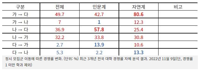 인문계는 나→다, 자연계는 가→다 이동시 정시모집 경쟁률 변화 커