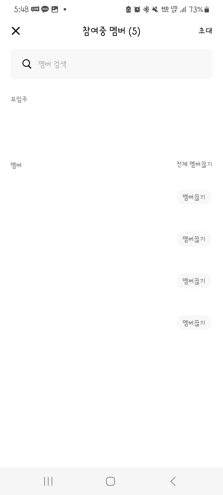 카카오뱅크 모임통장의 사용 종료로 인해 해지가 필요한 경우, 모임통장 → 우측 상단 '설정' → 모임멤버 화면으로 접속하여 전체 '멤버끊기' 후에 해지 처리가 가능합니다. 통장내 참여중인 멤버가 있는 경우 모임통장 해지는 불가능합니다.