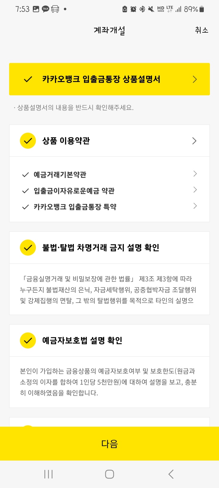 5. 관련내용 동의처리 후 '다음' 버튼 클릭 → 입출금계좌 개설