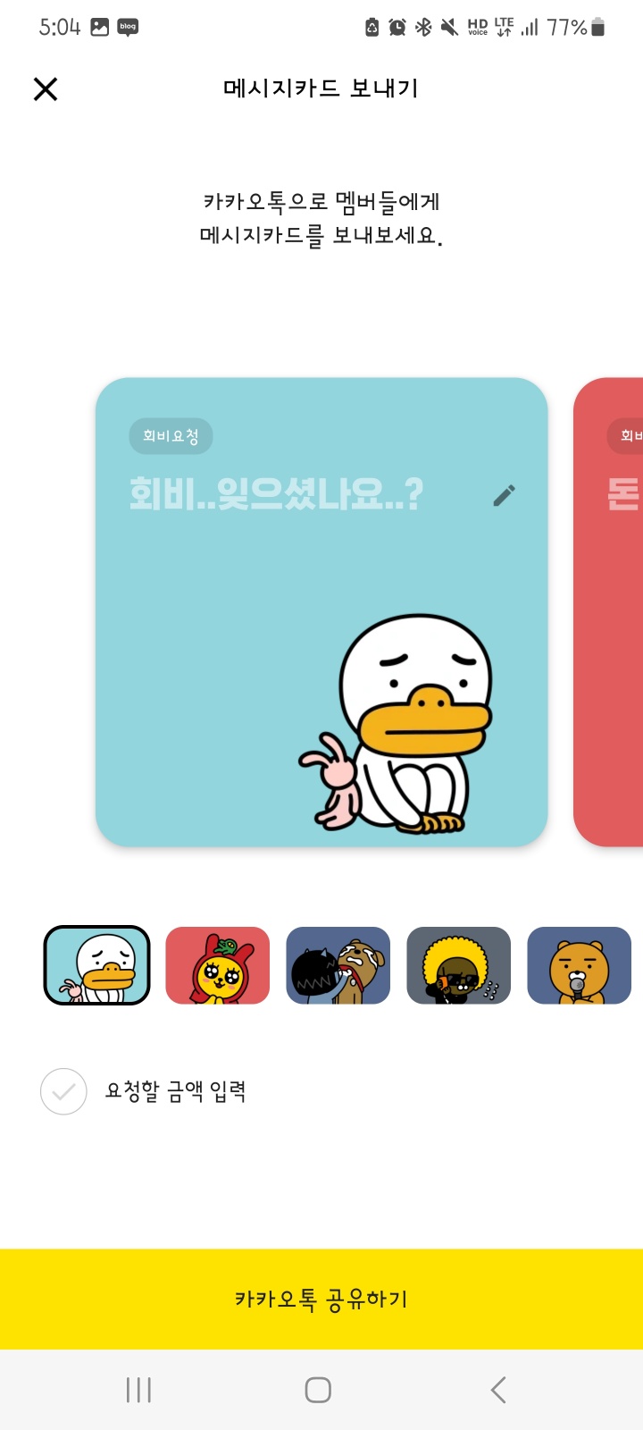 모임통장의 관리주체는 모임통장 → 우측 상단 '설정' → 메시지카드 보내기를 통해 회비를 미입금한 회원들에게 일괄 메시지를 발송 할 수 있습니다. 요청 금액을 입력 후 발송하면 상대방 카톡에 메시지가 전송됩니다.