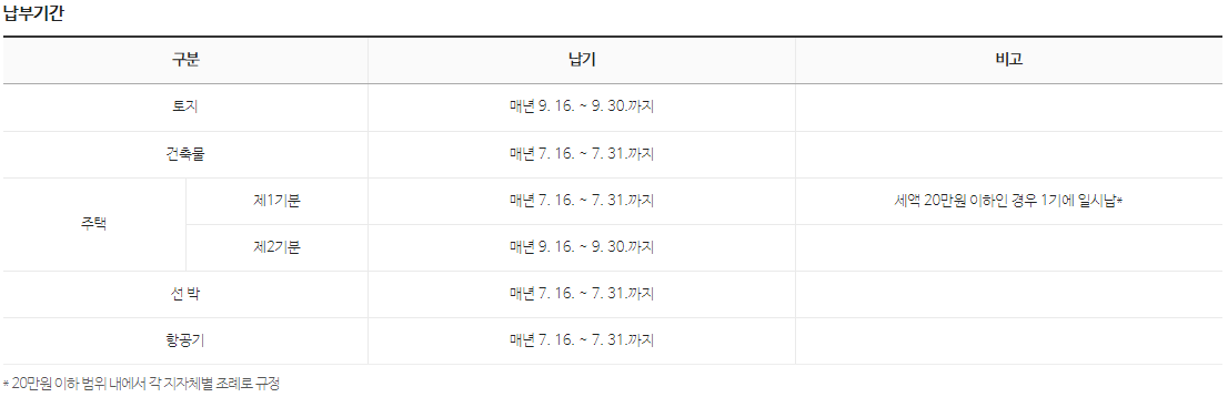 재산세 납부기간은 주택의 경우 재산세 총액이 20만원 이하인 경우 7/16~7/31일까지이며 재산세 총액이 20만원을 초과하는 경우 7/16~31일과 9/16~9/30일까지 2회 걸쳐 각 1/2씩 납부하면 됩니다. 토지의 경우 매년 9/16~30일까지, 건축물의 경우 매년 7/16~7/31일까지, 선박과 항공기의 경우 매년 7/16~7/31일까지 입니다.