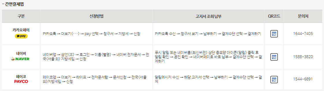 ①스마트폰을 이용한 간편결재(삼성페이, 카카오페이, 페이코)로 납부, 카카오페이를 이용해 재산세 납부 신청하는 방법은 아래를 참고해 보세요.