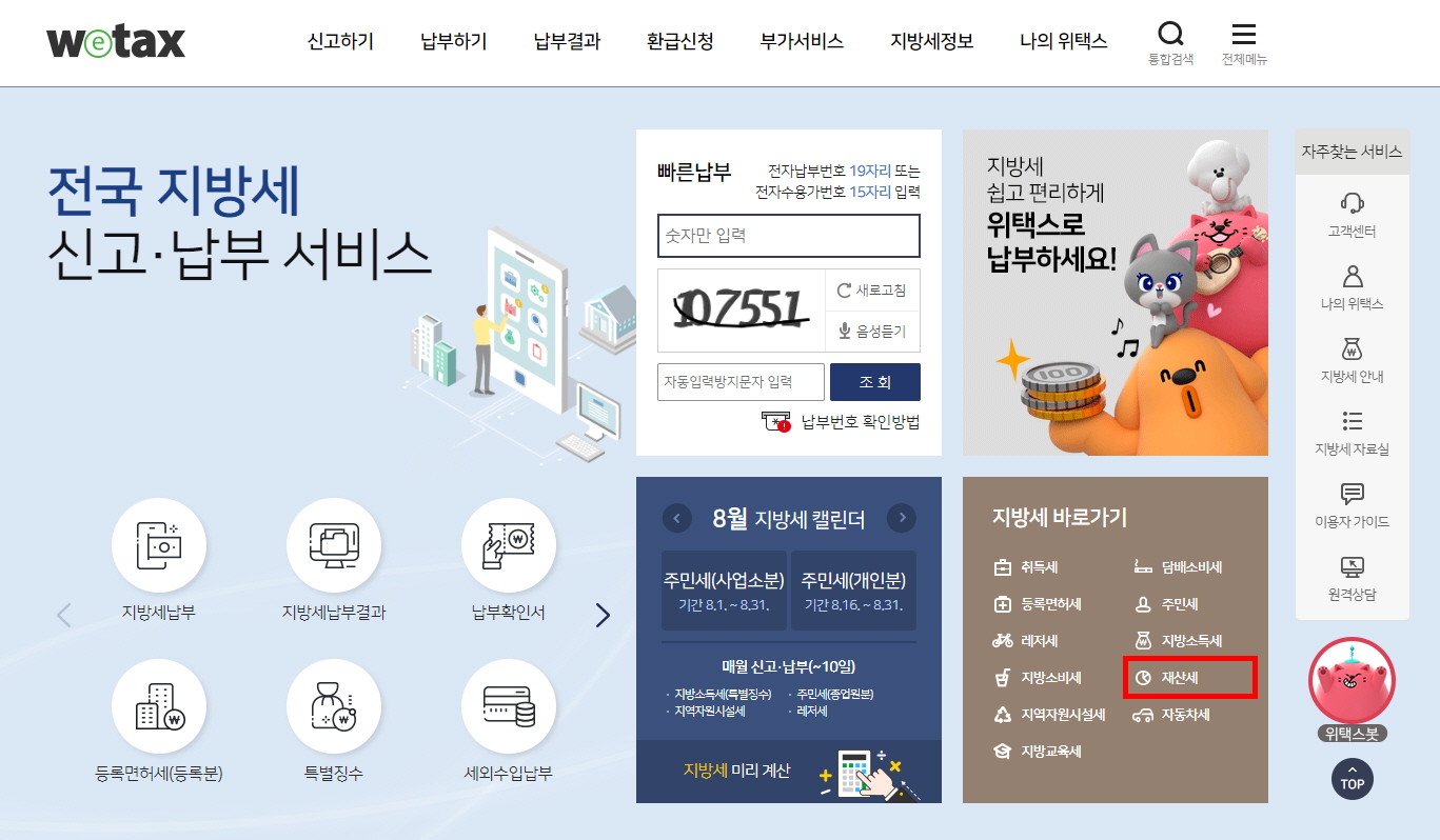 재산세를 조회하는 방법부터 말씀드리겠습니다. 재산세의 경우 위택스 홈페이지 첫 화면에서 간편하게 조회가 가능합니다. 조회하는 것도 귀찮으시다면 네이버, 카카오, 페이코 같은 간편결재 시스템을 통해 재산세 고지서 전자송달 신청을 통해 매년 알림 서비스를 받을 수 있습니다.