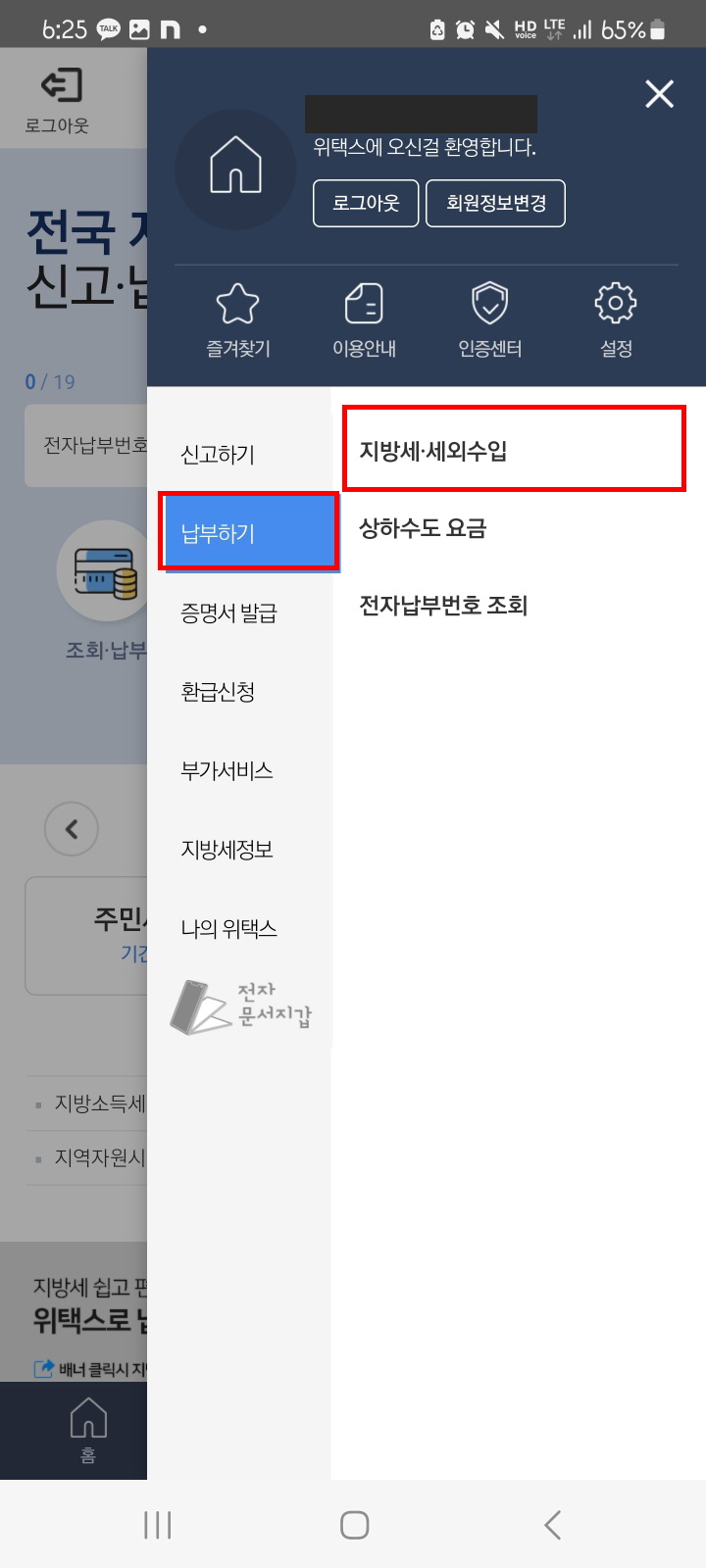 모바일 스마트위택스 앱을 통한 주민세 조회의 경우, 앱 접속 → 로그인 → 우측상단 3줄 클릭 → 납부하기 클릭 → 지방세·세외수입 클릭 → 주민세 조회의 순으로 가능합니다.