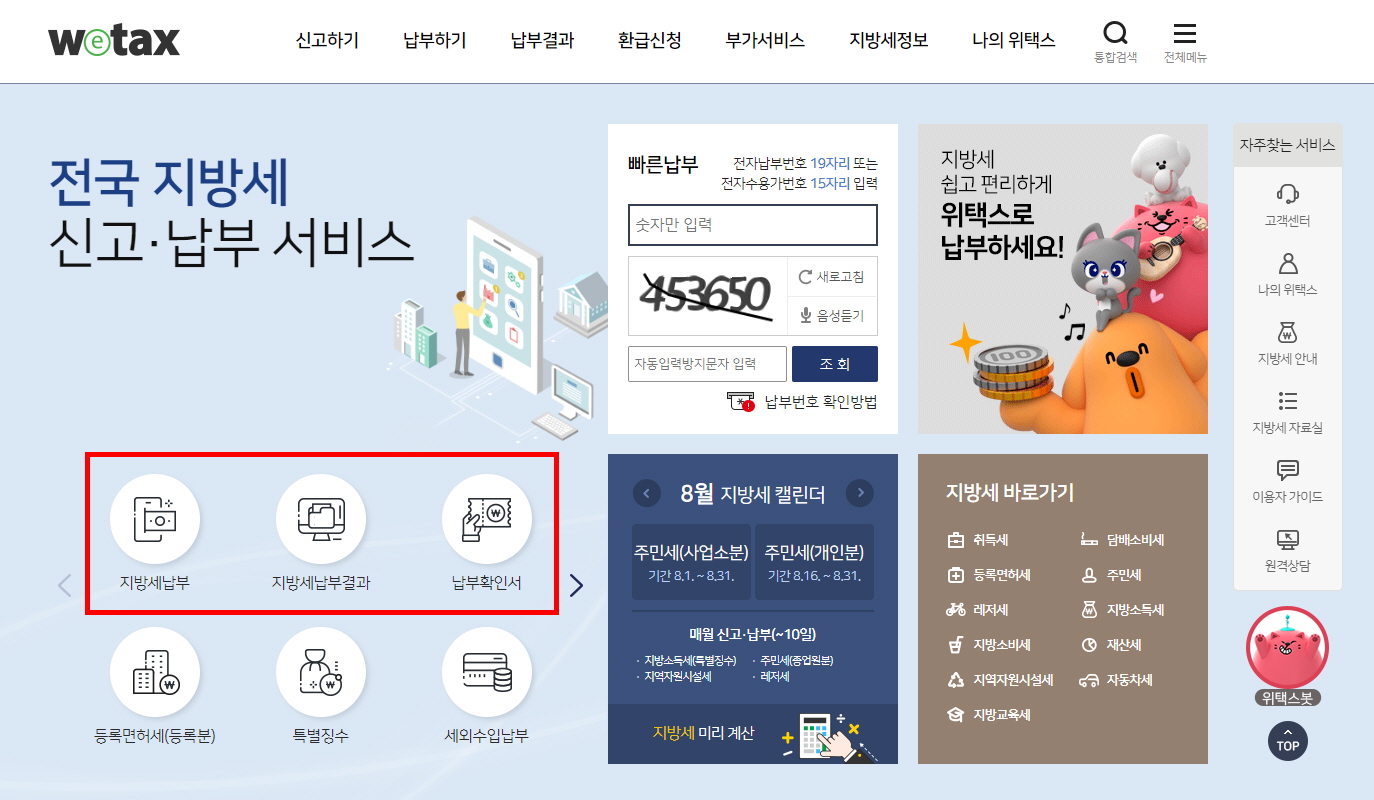 위택스 주민세 납부방법의 경우, 홈페이지 접속 → 로그인 → 상단 '신고하기' 클릭 → 주민세 선택 → 부과내역 검색 → 신고서 작성 → 선택납부 클릭하여 납부진행