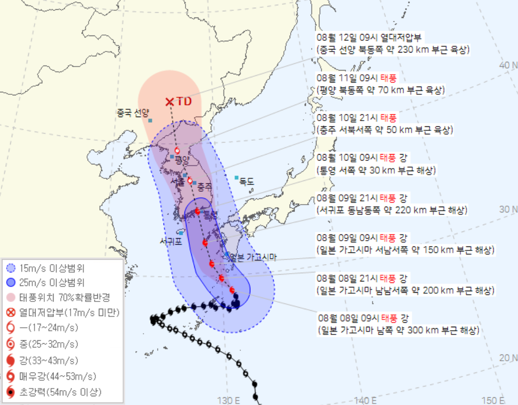 제주도를 지나 10일 오전 남해안에 상륙한 뒤 한반 도를 관통할 것으로 보입니다. 9일 오후 제주도를 시작으로 전남, 경남 남해안에도 태풍특보가 내려지겠고, 10일 목요일에는 남부, 충청, 수도권 순으로 직접 영향권에 들어서겠습니다.