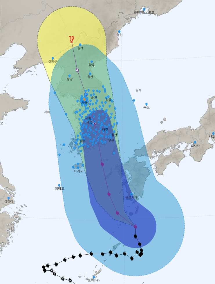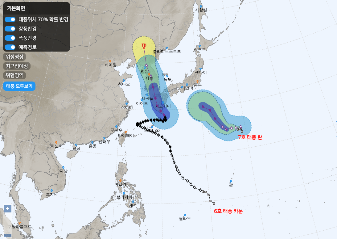 사실 태풍 카눈과 관련하여 가장 궁금한 것은 예상경로일겁니다. 팩트로 말씀드리면 8일 오후 현재 시점에서 태풍 카눈 예상경로는 제주도 쪽으로 올라올 것으로 보이며 9일부터 태풍 카눈의 직접 영향권에 접어들 것으로 예측합니다.