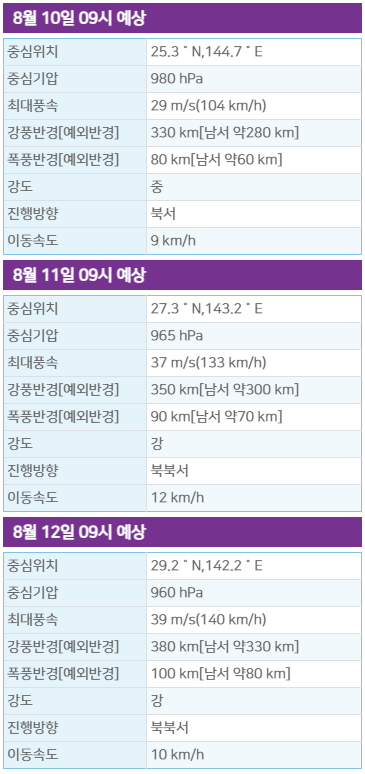 기상청 예보에 따르면, 태풍의 중심기압은 970hPa이고, 중심 최대 풍속은 30m/s다. 강풍반경은 250km로 우리나라 전역을 뒤덮을 정도 규모이며, 중심 초속은 35m/s로 매우 강한 바람을 동반하고 있습니다.