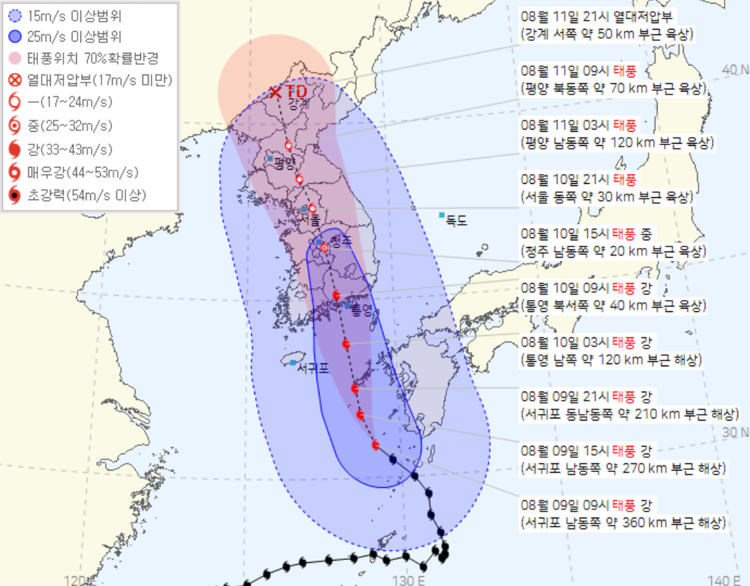 상륙시의 강풍반경이 340km로 한반도 동서 폭인 300km를 넘는다. 풍속이 25m/s이상인 폭풍반경도 120km에 달할 것으로 전망합니다. 북상하면서 세력이 커지는 이유는 북상 과정에서 해수면 온도가 27~29도로 평년보다 높기 때문에 해양열을 흡수하기 때문으로 보입니다.