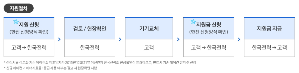 신청방법에 따라 신청시 꼭 기억하셔야 할 내용이 있습니다. 신청서류 검토와 기존 에어컨의 제조일자가 2015년12월31일 이전인지 한전의 현장확인이 필요하므로 반드시 기존 에어컨 철거 전에 신청을 하셔야 한다는 사실입니다.