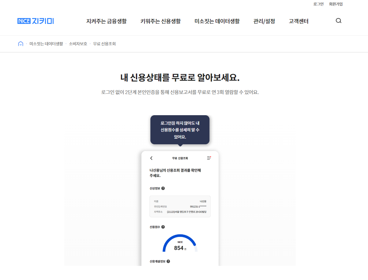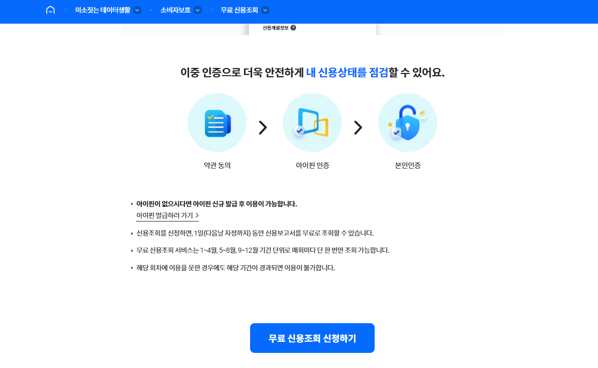 나이스(NICE)를 통해 신용등급 무료조회를 하려면 홈페이지에 우선 접속 합니다. 다음으로 페이지 내 검색에서 '무료신용조회' 검색 후 클릭합니다. 신용등급 무료조회 버튼을 클릭 후 약관에 동의합니다.
