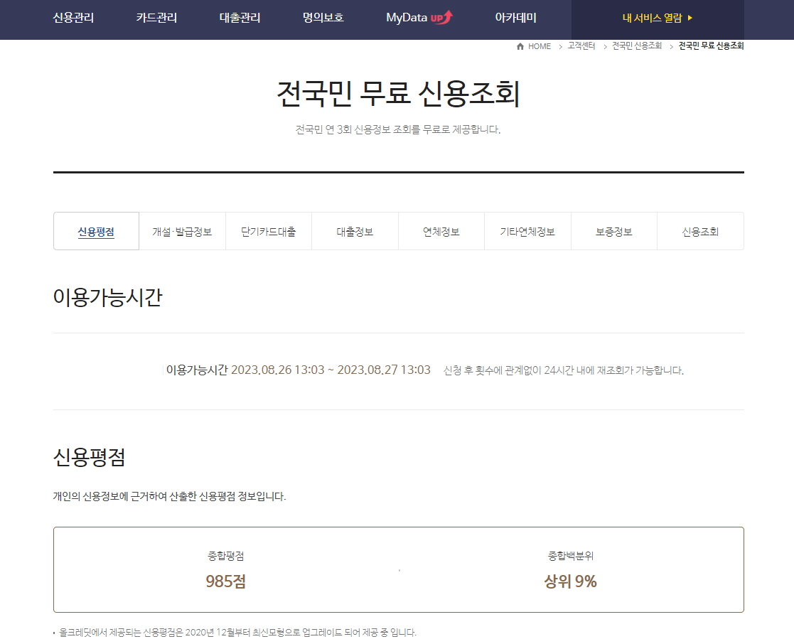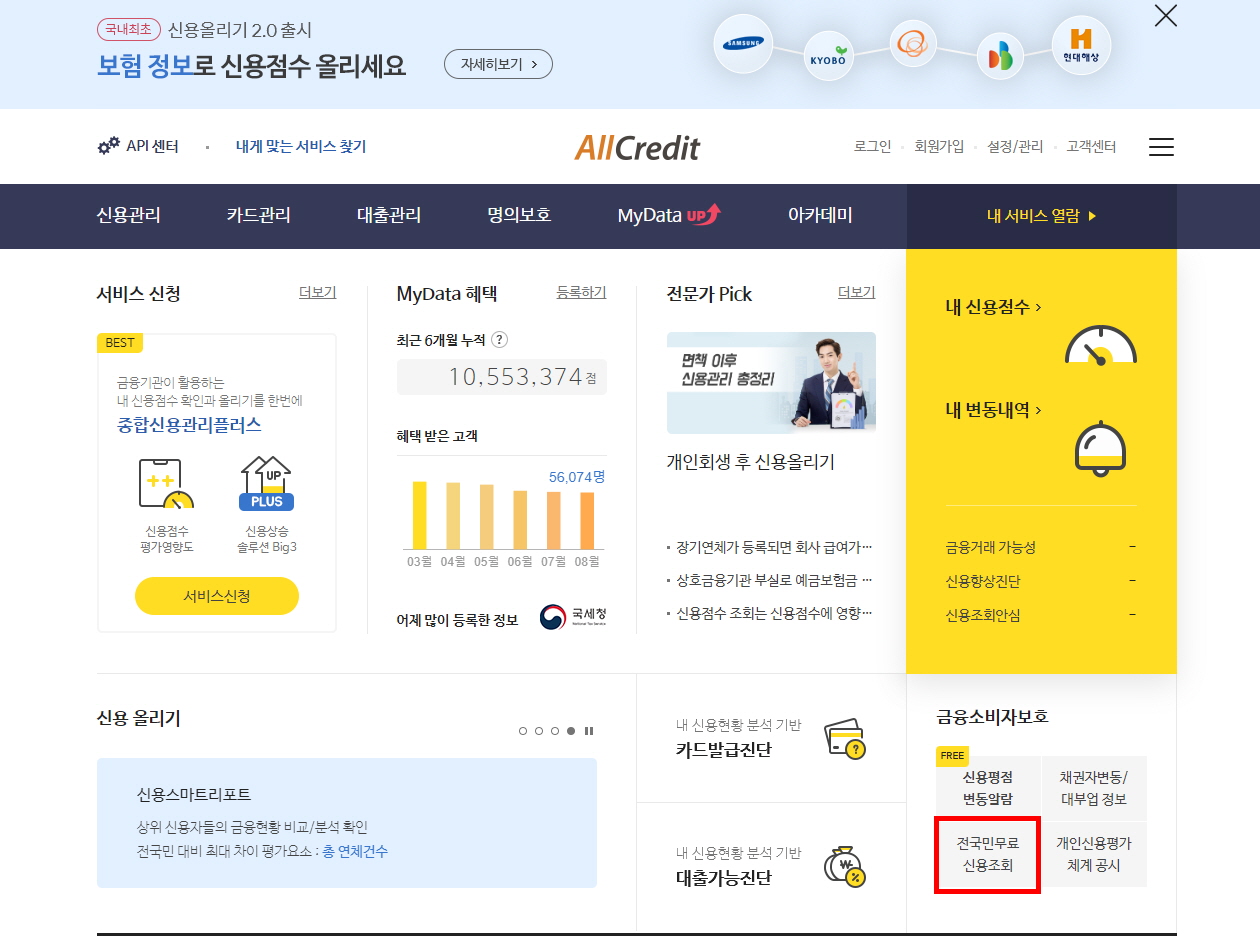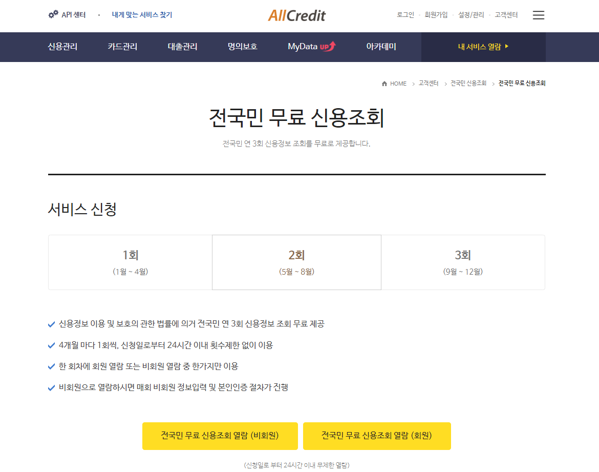 올크레딧(KCB)을 통해 신용등급 무료조회를 하려면 우선 홈페이지에 접속 합니다. 화면 우측 하단의 '전국민무료 신용조회' 버튼을 클릭하고 전국민무료 신용조회 열람 버튼을 클릭합니다.