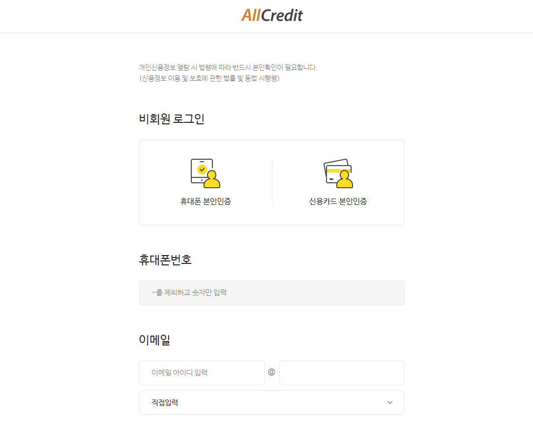 휴대폰 또는 신용카드 본인인증을 진행 후, 휴대폰 번호와 이메일을 입력하고 약관에 동의 처리하면 로그인이 완료됩니다. 마지막으로 아이핀 인증을 진행하면 신용등급 무료조회가 완료되어 최종 확인이 가능합니다. 아래에서 확인해 보시기 바랍니다.