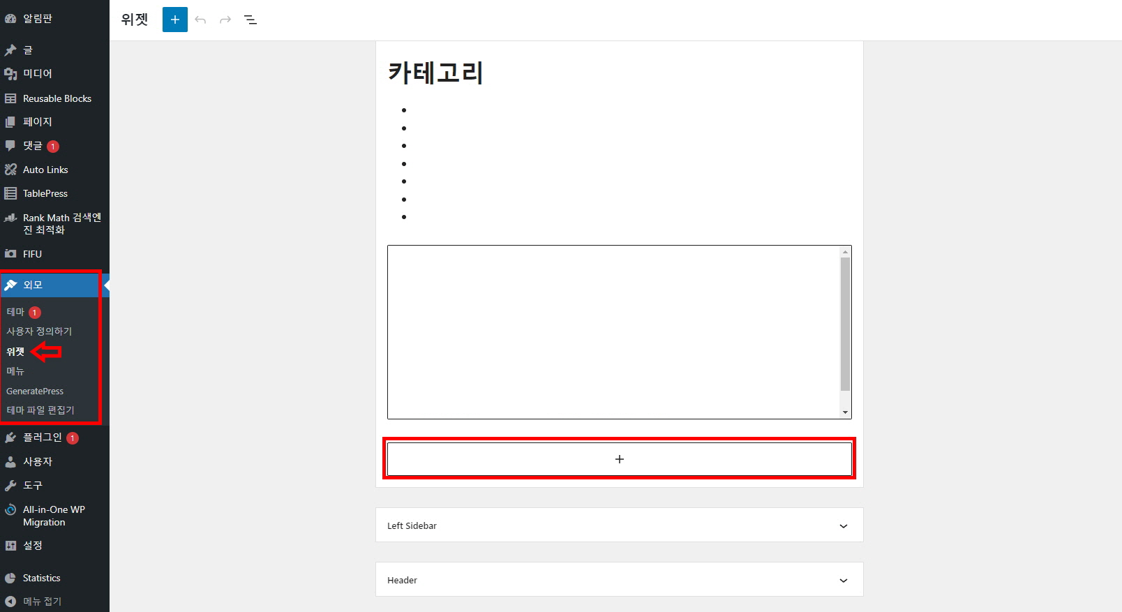 이제 마지막으로 위에서 복사한 위젯 코드를 내 워드프레스 블로그에 설치하는 방법입니다.