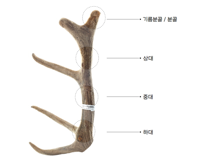 상대는 상부에서 5~15cm 부위를 말합니다. 녹용의 부위 중에서도 고가에 속하며, 상대 역시 조직의 밀도가 높은 편으로 부드러운 부위입니다.