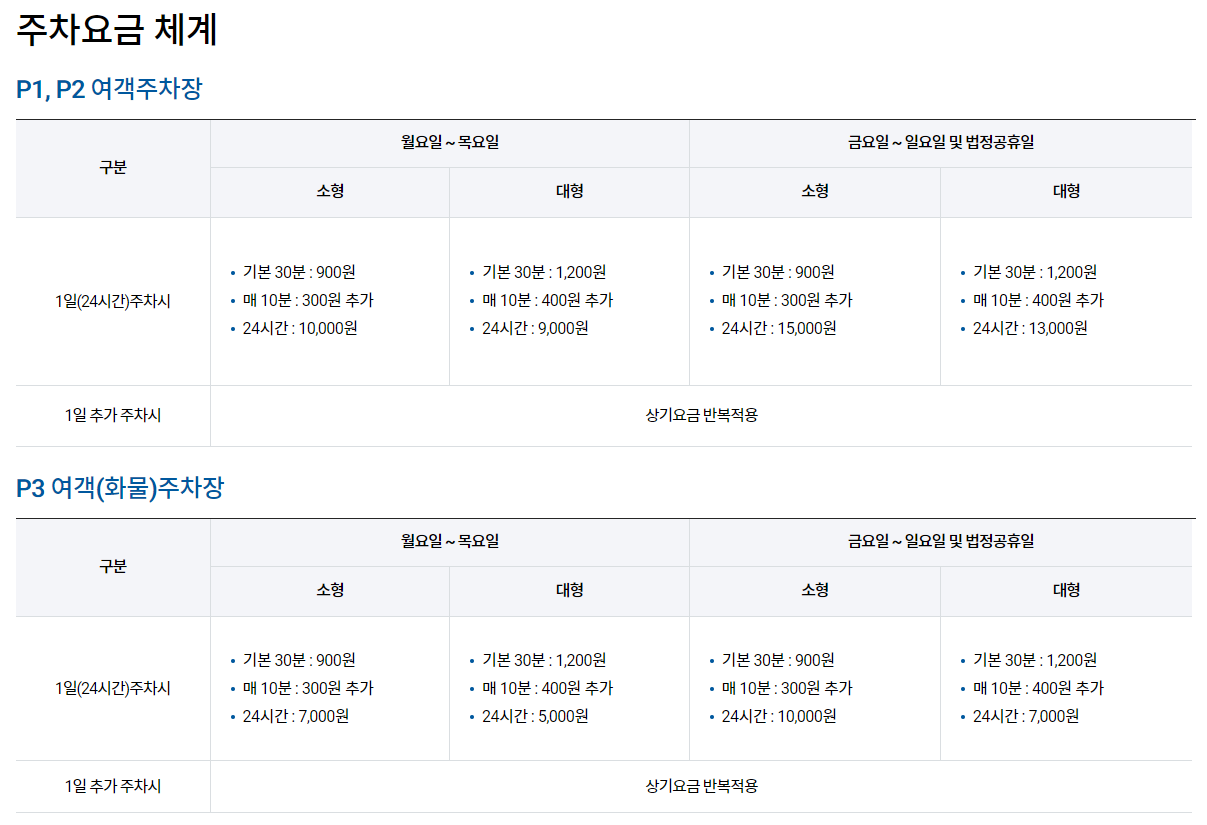 여행객들이 주로 이용하게 되는 김해공항 P1, P2 여객주차장의 주차요금은 아래와 같습니다. 평일(월~목) 주차요금은 일 1만 원이며, 주말(금~일) 및 공휴일은 1.5만 원입니다.