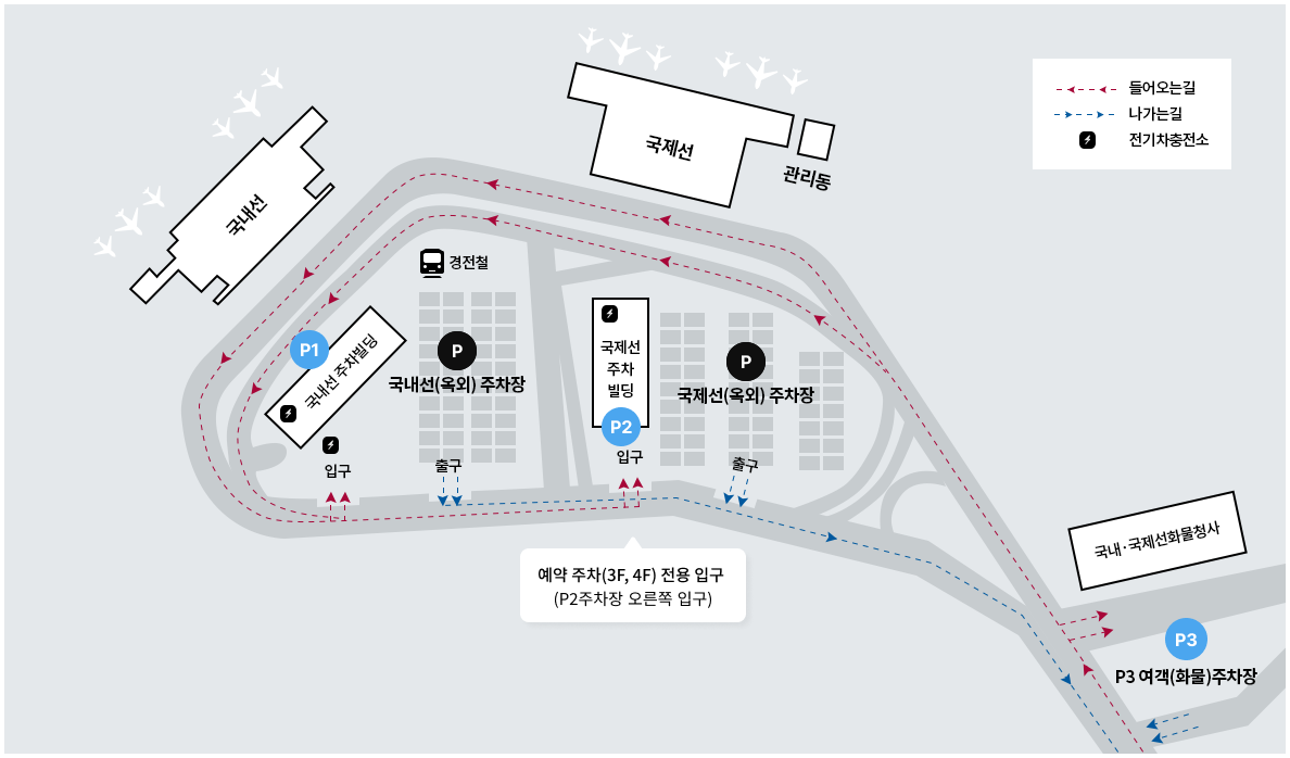 김해공항의 경우 여행객들의 주차 불편을 해소하기 위해 주차예약 서비스를 제공중에 있습니다. 입차 시간 2시간 이전부터, 최대 30일까지 예약이 가능합니다. 예약이 가능한 주차장의 위치는 P2 여객주차빌딩 3층과 4층이니 이용 전 위치를 꼭 확인하셔서 불편이 발생하지 않도록 하세요.