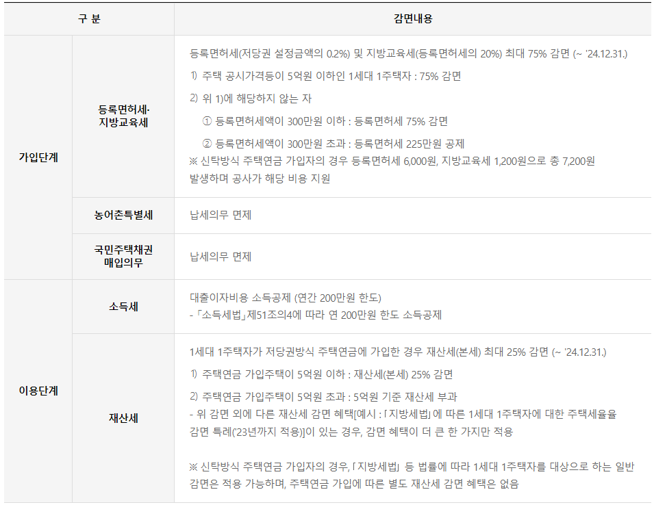 주택연금 이용 시에는 가입주택이 5억 원 이하일 경우 재산세 25%를 감면받으며 대출이자비용에 대해서도 연간 200만 원 한도내에서 소득공제를 받을 수 있습니다.