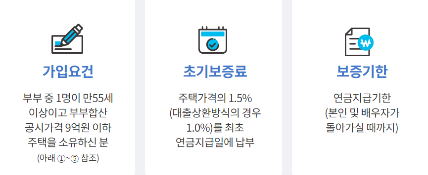 부부기준 공시가격 등이 9억 원 이하 주택소유자여야 합니다. 다주택자라도 합산 가격이 9억 이하면 가입이 가능합니다. 공시가격 등이 9억 원 초과 2주택자는 3년 이내 1주택 처분 시 가입이 가능합니다.