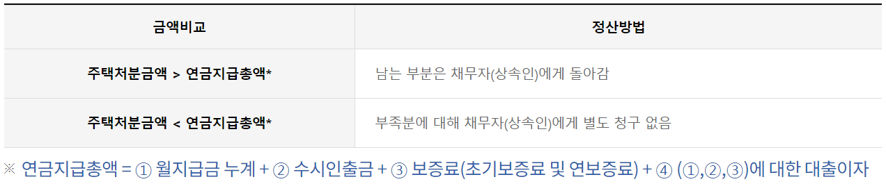 연금은 평생 혹은 정해진 기간(확정기간) 받을 수 있으며 부부 중 한 사람이 사망하더라도 감액없이 지급됩니다. 연금 수령자가 모두 사망할 경우에는 담보로 제공했던 주택을 한국주택금융공사가 매각하여 그 시점까지 연금으로 지급했던 돈을 상계합니다.