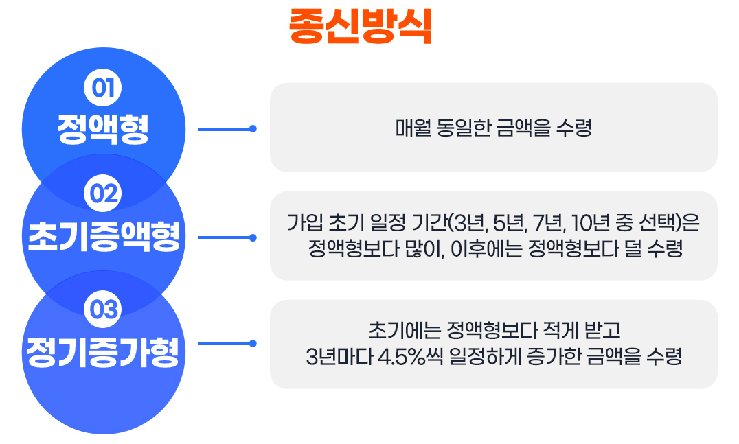 주택연금 상품선택 후, 수령방식으로는 아래의 3가지 중에서 선택하실 수 있습니다. 주택연금 이용 중 의료비 등 긴급자금 필요시 목돈을 수시로 찾아 쓰는 개별인출제도를 활용할 수 있습니다.