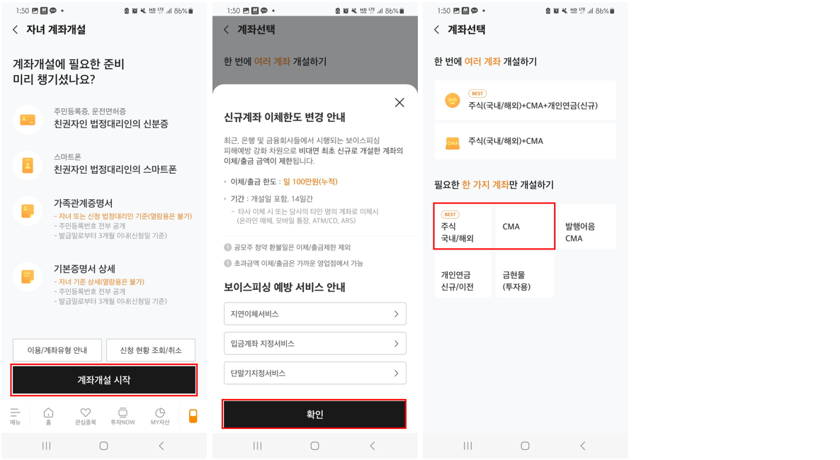 - 계좌 개설 시작 클릭 → 계좌종류 선택(주식 or CMA) → 계좌개설 필요내용 입력