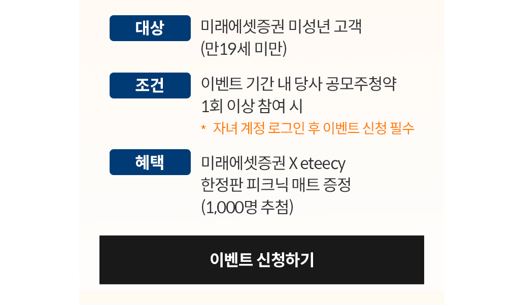 현재 미래에셋증권에서는 ~2023.10.20.일까지 우리아이 부자 만들기 이벤트가 진행 중에 있습니다. 이벤트 기간 내 계좌 개설 후 공모주청약 1회 이상 참여시 혜택이 제공된다고 합니다. 상세 내용은 아래를 통해서 확인해 보시기 바랍니다.
