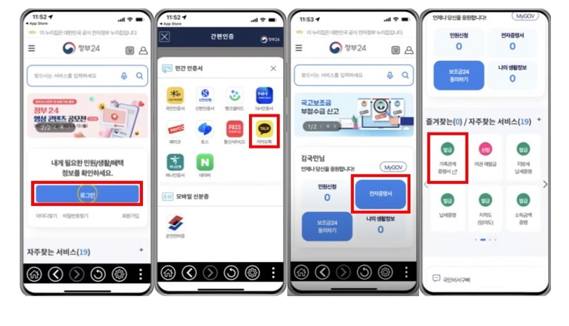 정부24 앱 다운로드 및 설치 → 간편인증(카카오톡 등) 로그인 → 전자문서지갑 발급 → 다시 정부24 홈 → 하단 '가족관계증명서 발급' 클릭