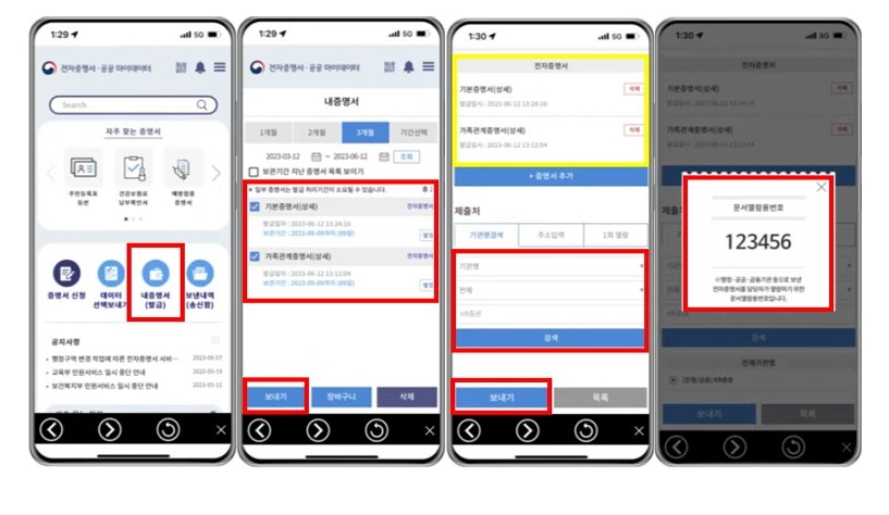 정부24 앱 접속 → 전자문서지갑 클릭 → 내 증명서(발급) → 가족관계증명서/ 기본증명서 선택 후 보내기 클릭 → 제출처(미래에셋증권) 선택 후 보내기 클릭 → 문서열람용 번호 기억하기