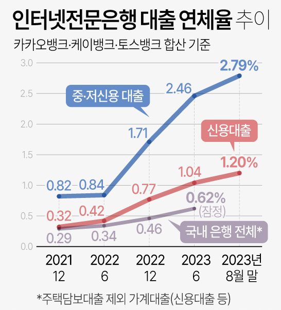 최근 인터넷 전문은행 3사(카카오뱅크, 토스뱅크, 케이뱅크)의 연체율이 급증하며 큰 이슈가 되고 있습니다. 중·저 신용대출 연체율은 더욱 가파르게 증가했습니다.