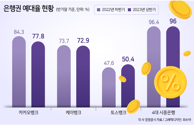 위와 같은 인터넷 전문은행의 노력에도 불구하고 예대율(예금 대비 대출 비율) 리스크는 여전히 큰 골칫거리 입니다. 예금 대비 대출 비율이 낮다는 것은, 그만큼 지출한 비용(예금) 대비 수익(대출)이 부족하다는 것이기 때문이다.