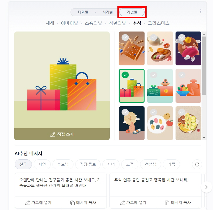 • 여러 기념일 中, 추석 클릭 → 우측에서 원하는 카드이미지 선택