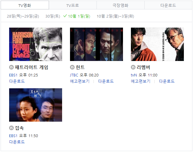 ④ 추석 영화 TV편성표:  10/2(월) ~ 10/3(화)