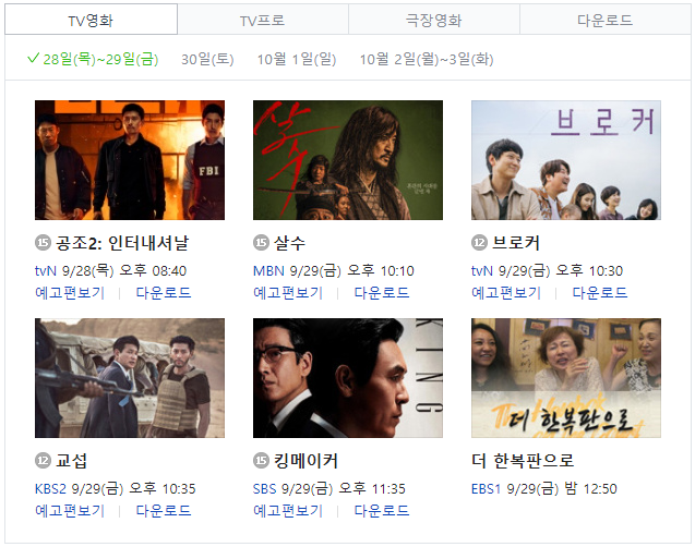 ①추석 영화 TV편성표: 9/28(목) ~ 9/29(금)