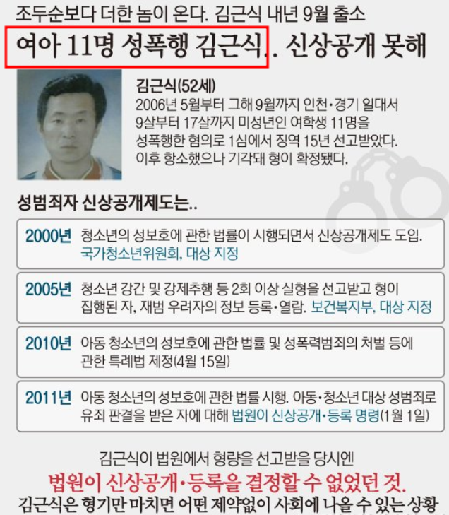 조두순 능가하는 악질 아동성범죄자 '제2의 조두순' 김근식 9월21일 출소 김근식 이달 21일 출소...