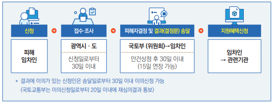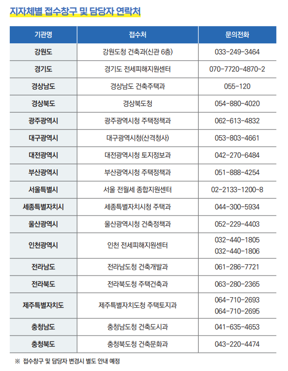 - 신청접수: 임차인 주민등록상 거주(피해주택) 소재지 관할 시 · 도(관할 시 · 도청, 동사무소 등 소재지별 담당 기관 必 확인)