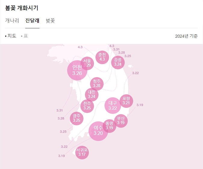 마지막으로 전국 봄꽃 개화시기에 관한 내용도 함께 소개해 드리겠습니다. 아래 이미지를 통해 개화일정을 체크해 보시면 되겠습니다.