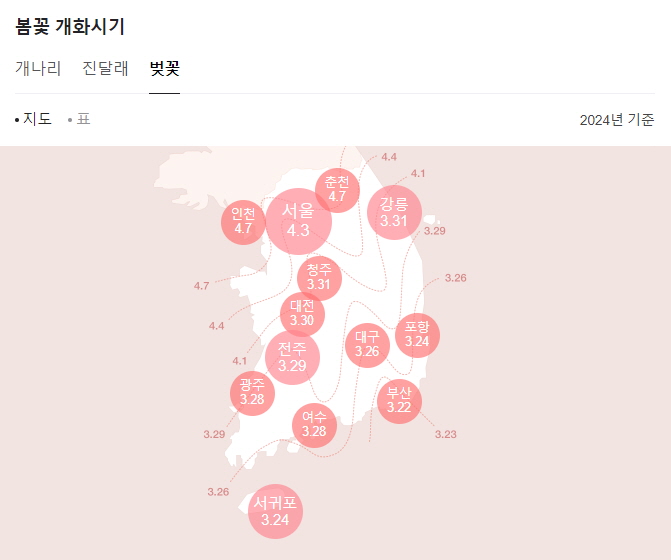 마지막으로 전국 봄꽃 개화시기에 관한 내용도 함께 소개해 드리겠습니다. 아래 이미지를 통해 개화일정을 체크해 보시면 되겠습니다.