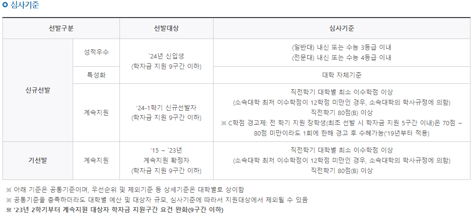 • 2018년 이후 선발자: 최초 선발학기포함 학자금 지원구간(소득분위)에 따라 최대 전학기 지원 또는 1년(2학기) 지원