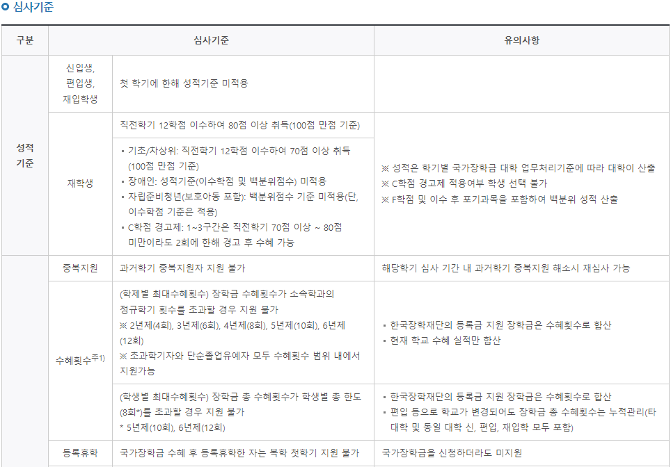 - 2018년 이후 선발자: 최초 선발학기포함 학자금 지원구간(소득분위)에 따라 최대 전학기 지원 또는 1년(2학기) 지원