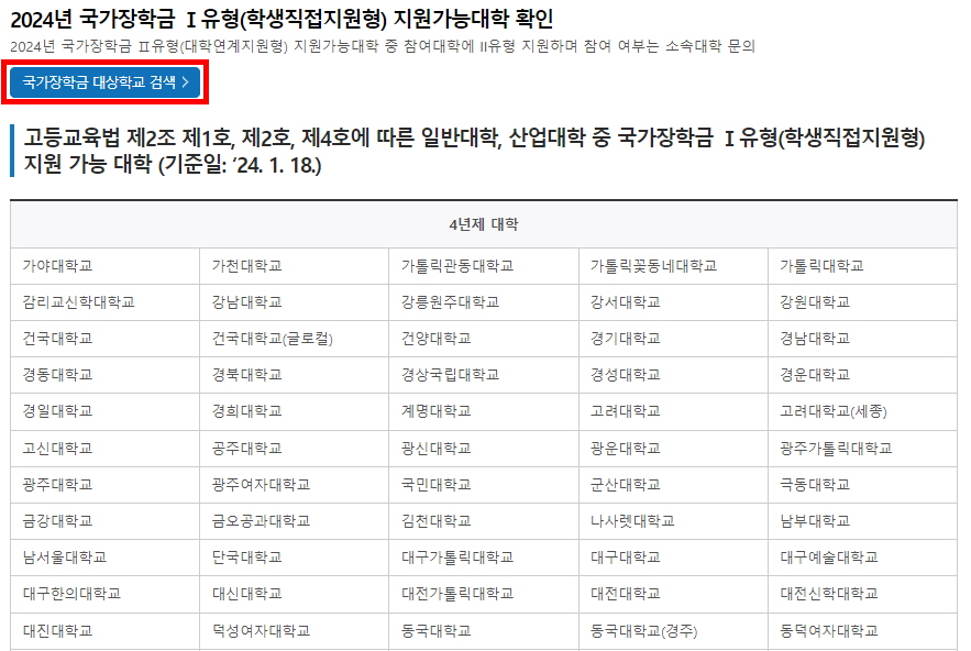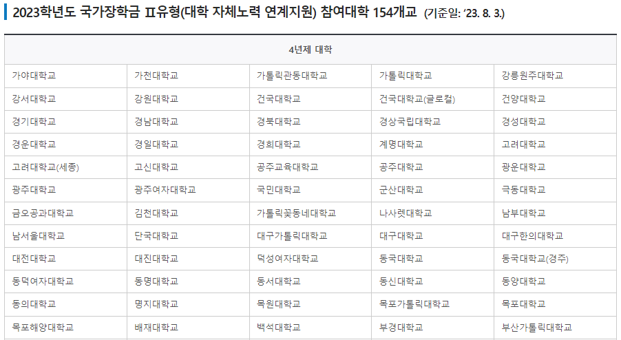 2023년 대학구조개혁위원회 심의 결과, 국가장학금 Ⅰ유형(학생직접지원형)의 지원가능대학은 아래와 같습니다. 여기에 해당하는 대학의 대학생만이 국가장학금 Ⅰ유형을 지원받을 수 있습니다. 거의 모든 대학이 해당이 되지만 그래도 확인은 해보시기 바랍니다.