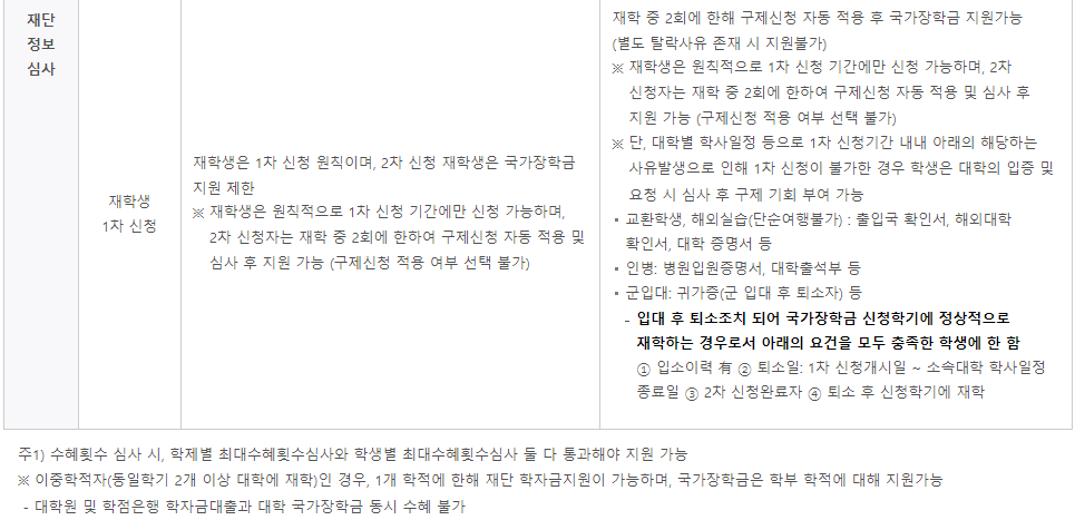 원칙적으로 재학생은 1차 신청 기간에만 신청이 가능하며, 2차 신청자는 재학 중 2회에 한해 제공되는 구제신청 자동 적용 및 심사하게 되니 주의가 필요합니다.