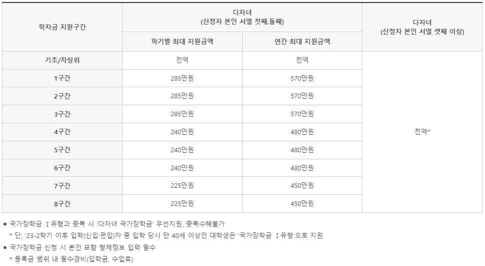 학자금 지원구간(소득분위)별 지원금액은 신청자의 본인 서열(첫째, 둘째 등)에 따라 다르며, 국가장학금 Ⅰ유형과 중복 시 '다자녀 국가장학금'을 우선지원하며 중복수혜는 불가합니다.