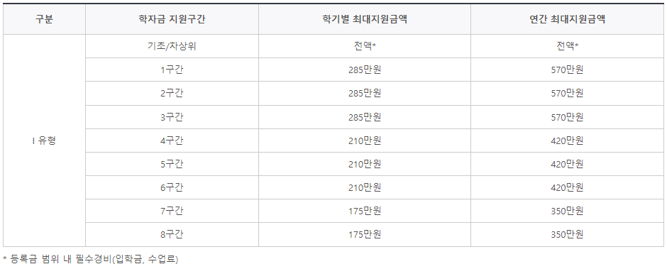 • 2018년 이후 선발자: 최초 선발학기포함 학자금 지원구간(소득분위)에 따라 최대 전학기 지원 또는 1년(2학기) 지원
