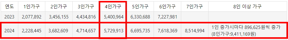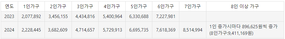 아래는 2024년 가구원 수별 기준 중위소득 입니다. 신청자의 가구원 수에 해당하는 기준 중위소득으로 경곗값이 결정되겠습니다.