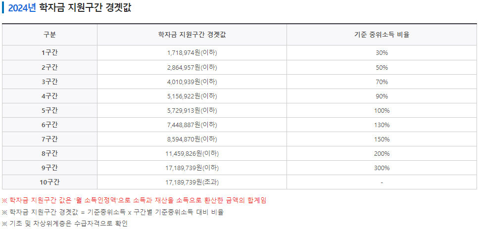 국가장학금 지급을 위한 소득분위(학자금 지원구간) 경곗값은 매년 보건복지부에서 발표하는 기준 중위소득과 연계해서 결정됩니다. 기준 중위소득은 국민 가구소득의 중윗값을 말하며, 대한민국 국민의 총 가구의 월 세전 소득을 조사하여 오름차순 배열 뒤 정확히 중간에 있는 값이 바로 중위소득입니다.